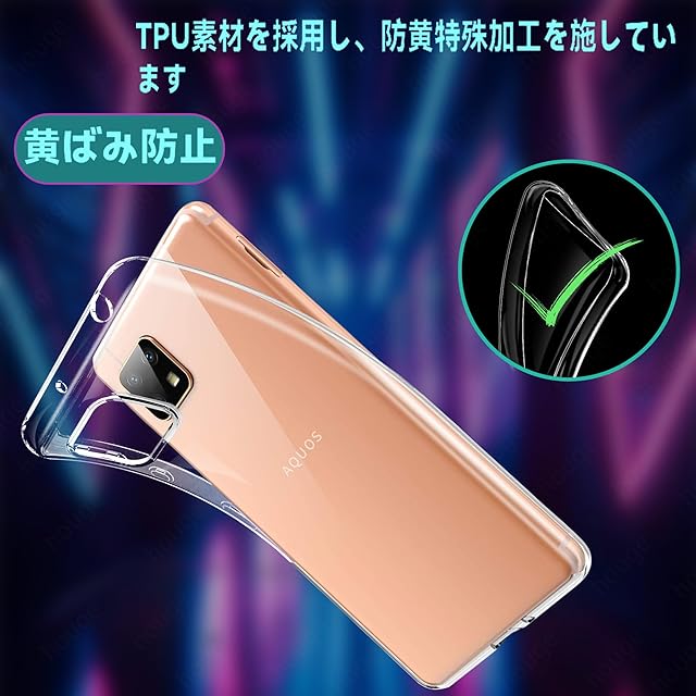 【対応機種】AQUOS sense4 / lite / basic / sense5G / SH-M15 / SH-41A / SH-M17 / SH-53A / SHG03;商品の内容:ケース クリア * 1枚 + ストラップホール付属 ネックストラップ付。<br> 【高透過率】透明度が高く、本体の鮮やかな色をそのまま映し出すことができます;見た目から手触りまで全てが一体となり、手垢や皮脂などを落として常に綺麗な状態を保つことができます。<br> 【耐衝撃】高品質のTPU素材を使用し、ソフトシリコンエッジで外部からの衝撃を吸収することができます;落下や衝撃、擦り傷などからスマホをしっかりと保護します。<br> 【薄型 軽量型】保護性と軽量性の両立を実現し、長く持っても手が疲れる感じもありません;手の汗を防ぎ、滑り止め、またあなたの携帯電話を保護します。<br> 【黄ばみ防止】本製品は高品質のTPU素材を採用し、黄ばみを防止する特殊加工を施しています;装着感と耐久性に優れ、変色や変形も起こりにくくなっています;スマホ本体への擦り傷を防ぐこともできます。<br> 【精密の設計】端末にぴったりフィットするよう設計されており、独自の上下隙間設計により、ボタンの反応が良く、程よい押し心地を実現しています。で正確なカットアウトにより、充電やイヤホン接続などもスムーズに行え、て簡単に装着できます。<br> 【ズレにくく 脱着が楽】本製品は柔らかい素材でできており、スマホに装着したり外したりする時も適度に曲げることができます。<br> 【指紋防止】表面特殊コーティング加工、オイルコーティング加工、高精度の表面処理を採用しています。指紋や汚れがついても、簡単に拭くだけでピカピカになれる。<br> 【疎水性 撥油性】表面に特殊なコーティングを施しており、オイルコーティング加工、スムースタッチ加工など、様々な特殊加工を組み合わせることで、油分やホコリに強く抵抗力を持ち。