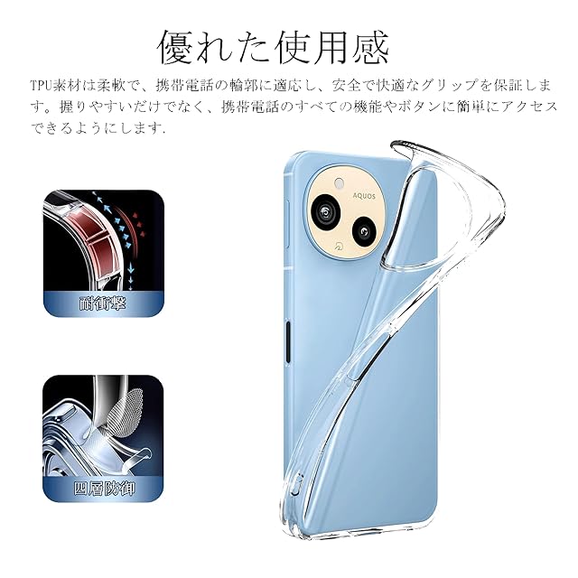 <p>1.【対応機種】AQUOS sense9 SH-53E SHG14 SH-M29 クリア ケースです。<br>2.【高い透明度】背面は高透明度ポリカーボネートの素材で、スマホ本来の崇高な美しさと色をそのままに生かし、スマホ本来の画面の雰囲気を保ち。 透明度が高く、 本体のオリジナルのカラーを損ねません。ケースの端はダイヤモンドカットプロセスを施すことでより洗練された美しい外観となっています。クリアケースの裏面に、家族やペットの写真、シールなどをいれて自分好みのアレンジできます。<br>3.【黄変防止で長く活用でき!】環境に優しく、無毒無味の高品質素材採用して抗酸化処理が施されており、長く透明度を維持することができます。本来の崇高な美しさと高級感を損なわなく、いつものスマホに上品さをプラス!<br>4.【全面の保護】卓上に置いても傷がつきにくく、滑り止めに効果で、高い耐衝撃性です、ケース背面までも傷から守れます。スマホを全方位からしっかりと守ります。フチをわずかに高く設計することで、を平らな場所に置いたときにスクリーンやカメラがこすれて傷つくのを防ぎます。<br>5.【ウォーターマーク防止】このケースの内側にはマイクロドットが付いているので、ケースがスマホに貼り付くのを防ぐことができ。<br>6.【持ちやすい】軽量な上、厚みもかさばることありません。細かいところにもちょうどよく、穴位置も正しく、すべてのスピーカー、ポート、ボタンは使いやすいです。持ち心地よくて手にフィットして滑りにくいので落としてしまう心配が減らします。<br>7.【スレ傷指紋防止】表面撥油性コーティング設計、滑り止め効果あり、指紋軽減、油汚れ防止、防汗、繊細な手触り感、爽やかな感触も与えます。<br>8.【衝撃吸収】 ケースのバンパーとコーナー部分は、日常生活における衝撃を確実に吸収します、360°全方位からスマホを保護してくれます、落下や衝撃による損傷を軽減します。耐久性に優れた。傷がつきにくいポリカーボネート素材を採用しております。高耐衝撃構造で作られ、熟練の技術に裏付けられたクッション加工、落下衝撃を全方位吸収し、期待に裏切らない頑丈さを持つ。落下の衝撃から重要なスマホを守ってくれます。安定することで、スマホの操作性も優秀です。</p>