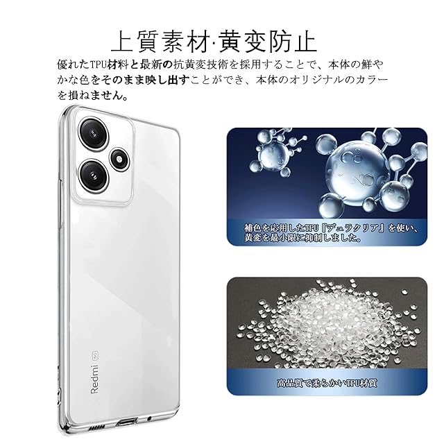 <p>1.【対応機種】For Xiaomi Redmi 12 5G XIG03 クリア ケースです。<br>2.【高い透明度】背面は高透明度ポリカーボネートの素材で、スマホ本来の崇高な美しさと色をそのままに生かし、スマホ本来の画面の雰囲気を保ち。 透明度が高く、 本体のオリジナルのカラーを損ねません。ケースの端はダイヤモンドカットプロセスを施すことでより洗練された美しい外観となっています。クリアケースの裏面に、家族やペットの写真、シールなどをいれて自分好みのアレンジできます。<br>3.【黄変防止で長く活用でき!】環境に優しく、無毒無味の高品質素材採用して抗酸化処理が施されており、長く透明度を維持することができます。本来の崇高な美しさと高級感を損なわなく、いつものスマホに上品さをプラス!<br>4.【全面の保護】卓上に置いても傷がつきにくく、滑り止めに効果で、高い耐衝撃性です、ケース背面までも傷から守れます。スマホを全方位からしっかりと守ります。フチをわずかに高く設計することで、を平らな場所に置いたときにスクリーンやカメラがこすれて傷つくのを防ぎます。<br>5.【ウォーターマーク防止】このケースの内側にはマイクロドットが付いているので、ケースがスマホに貼り付くのを防ぐことができ。<br>6.【持ちやすい】軽量な上、厚みもかさばることありません。細かいところにもちょうどよく、穴位置も正しく、すべてのスピーカー、ポート、ボタンは使いやすいです。持ち心地よくて手にフィットして滑りにくいので落としてしまう心配が減らします。<br>7.【スレ傷指紋防止】表面撥油性コーティング設計、滑り止め効果あり、指紋軽減、油汚れ防止、防汗、繊細な手触り感、爽やかな感触も与えます。<br>8.【衝撃吸収】 ケースのバンパーとコーナー部分は、日常生活における衝撃を確実に吸収します、360°全方位からスマホを保護してくれます、落下や衝撃による損傷を軽減します。耐久性に優れた。傷がつきにくいポリカーボネート素材を採用しております。高耐衝撃構造で作られ、熟練の技術に裏付けられたクッション加工、落下衝撃を全方位吸収し、期待に裏切らない頑丈さを持つ。落下の衝撃から重要なスマホを守ってくれます。安定することで、スマホの操作性も優秀です。</p>