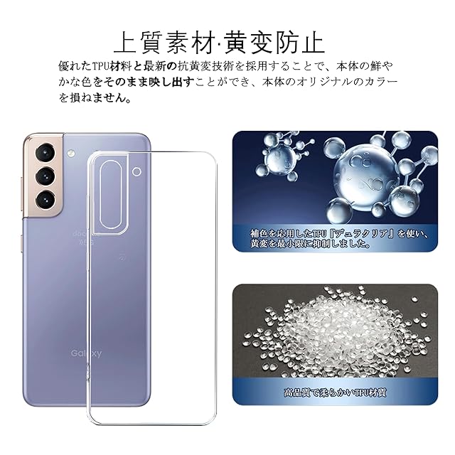 <p>1.【対応機種】Galaxy S21 5G SCG09 SC-51B クリア ケースです。<br>2.【高い透明度】背面は高透明度ポリカーボネートの素材で、スマホ本来の崇高な美しさと色をそのままに生かし、スマホ本来の画面の雰囲気を保ち。 透明度が高く、 本体のオリジナルのカラーを損ねません。ケースの端はダイヤモンドカットプロセスを施すことでより洗練された美しい外観となっています。クリアケースの裏面に、家族やペットの写真、シールなどをいれて自分好みのアレンジできます。<br>3.【黄変防止で長く活用でき!】環境に優しく、無毒無味の高品質素材採用して抗酸化処理が施されており、長く透明度を維持することができます。本来の崇高な美しさと高級感を損なわなく、いつものスマホに上品さをプラス!<br>4.【全面の保護】卓上に置いても傷がつきにくく、滑り止めに効果で、高い耐衝撃性です、ケース背面までも傷から守れます。スマホを全方位からしっかりと守ります。フチをわずかに高く設計することで、を平らな場所に置いたときにスクリーンやカメラがこすれて傷つくのを防ぎます。<br>5.【ウォーターマーク防止】このケースの内側にはマイクロドットが付いているので、ケースがスマホに貼り付くのを防ぐことができ。<br>6.【持ちやすい】軽量な上、厚みもかさばることありません。細かいところにもちょうどよく、穴位置も正しく、すべてのスピーカー、ポート、ボタンは使いやすいです。持ち心地よくて手にフィットして滑りにくいので落としてしまう心配が減らします。<br>7.【スレ傷指紋防止】表面撥油性コーティング設計、滑り止め効果あり、指紋軽減、油汚れ防止、防汗、繊細な手触り感、爽やかな感触も与えます。<br>8.【衝撃吸収】 ケースのバンパーとコーナー部分は、日常生活における衝撃を確実に吸収します、360°全方位からスマホを保護してくれます、落下や衝撃による損傷を軽減します。耐久性に優れた。傷がつきにくいポリカーボネート素材を採用しております。高耐衝撃構造で作られ、熟練の技術に裏付けられたクッション加工、落下衝撃を全方位吸収し、期待に裏切らない頑丈さを持つ。落下の衝撃から重要なスマホを守ってくれます。安定することで、スマホの操作性も優秀です。</p>