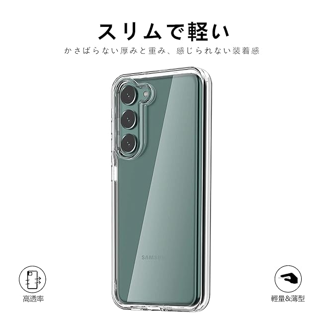 <p>1.【対応機種】Galaxy S23 SC-51D SCG19 クリア ケースです。<br>2.【高い透明度】背面は高透明度ポリカーボネートの素材で、スマホ本来の崇高な美しさと色をそのままに生かし、スマホ本来の画面の雰囲気を保ち。 透明度が高く、 本体のオリジナルのカラーを損ねません。ケースの端はダイヤモンドカットプロセスを施すことでより洗練された美しい外観となっています。クリアケースの裏面に、家族やペットの写真、シールなどをいれて自分好みのアレンジできます。<br>3.【黄変防止で長く活用でき!】環境に優しく、無毒無味の高品質素材採用して抗酸化処理が施されており、長く透明度を維持することができます。本来の崇高な美しさと高級感を損なわなく、いつものスマホに上品さをプラス!<br>4.【全面の保護】卓上に置いても傷がつきにくく、滑り止めに効果で、高い耐衝撃性です、ケース背面までも傷から守れます。スマホを全方位からしっかりと守ります。フチをわずかに高く設計することで、を平らな場所に置いたときにスクリーンやカメラがこすれて傷つくのを防ぎます。<br>5.【ウォーターマーク防止】このケースの内側にはマイクロドットが付いているので、ケースがスマホに貼り付くのを防ぐことができ。<br>6.【持ちやすい】軽量な上、厚みもかさばることありません。細かいところにもちょうどよく、穴位置も正しく、すべてのスピーカー、ポート、ボタンは使いやすいです。持ち心地よくて手にフィットして滑りにくいので落としてしまう心配が減らします。<br>7.【スレ傷指紋防止】表面撥油性コーティング設計、滑り止め効果あり、指紋軽減、油汚れ防止、防汗、繊細な手触り感、爽やかな感触も与えます。<br>8.【衝撃吸収】 ケースのバンパーとコーナー部分は、日常生活における衝撃を確実に吸収します、360°全方位からスマホを保護してくれます、落下や衝撃による損傷を軽減します。耐久性に優れた。傷がつきにくいポリカーボネート素材を採用しております。高耐衝撃構造で作られ、熟練の技術に裏付けられたクッション加工、落下衝撃を全方位吸収し、期待に裏切らない頑丈さを持つ。落下の衝撃から重要なスマホを守ってくれます。安定することで、スマホの操作性も優秀です。</p>