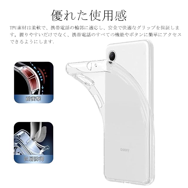 <p>1.【対応機種】Galaxy A23 5G SCG18 SC-56C クリア ケースです。<br>2.【高い透明度】背面は高透明度ポリカーボネートの素材で、スマホ本来の崇高な美しさと色をそのままに生かし、スマホ本来の画面の雰囲気を保ち。 透明度が高く、 本体のオリジナルのカラーを損ねません。ケースの端はダイヤモンドカットプロセスを施すことでより洗練された美しい外観となっています。クリアケースの裏面に、家族やペットの写真、シールなどをいれて自分好みのアレンジできます。<br>3.【黄変防止で長く活用でき!】環境に優しく、無毒無味の高品質素材採用して抗酸化処理が施されており、長く透明度を維持することができます。本来の崇高な美しさと高級感を損なわなく、いつものスマホに上品さをプラス!<br>4.【全面の保護】卓上に置いても傷がつきにくく、滑り止めに効果で、高い耐衝撃性です、ケース背面までも傷から守れます。スマホを全方位からしっかりと守ります。フチをわずかに高く設計することで、を平らな場所に置いたときにスクリーンやカメラがこすれて傷つくのを防ぎます。<br>5.【ウォーターマーク防止】このケースの内側にはマイクロドットが付いているので、ケースがスマホに貼り付くのを防ぐことができ。<br>6.【持ちやすい】軽量な上、厚みもかさばることありません。細かいところにもちょうどよく、穴位置も正しく、すべてのスピーカー、ポート、ボタンは使いやすいです。持ち心地よくて手にフィットして滑りにくいので落としてしまう心配が減らします。<br>7.【スレ傷指紋防止】表面撥油性コーティング設計、滑り止め効果あり、指紋軽減、油汚れ防止、防汗、繊細な手触り感、爽やかな感触も与えます。<br>8.【衝撃吸収】 ケースのバンパーとコーナー部分は、日常生活における衝撃を確実に吸収します、360°全方位からスマホを保護してくれます、落下や衝撃による損傷を軽減します。耐久性に優れた。傷がつきにくいポリカーボネート素材を採用しております。高耐衝撃構造で作られ、熟練の技術に裏付けられたクッション加工、落下衝撃を全方位吸収し、期待に裏切らない頑丈さを持つ。落下の衝撃から重要なスマホを守ってくれます。安定することで、スマホの操作性も優秀です。</p>