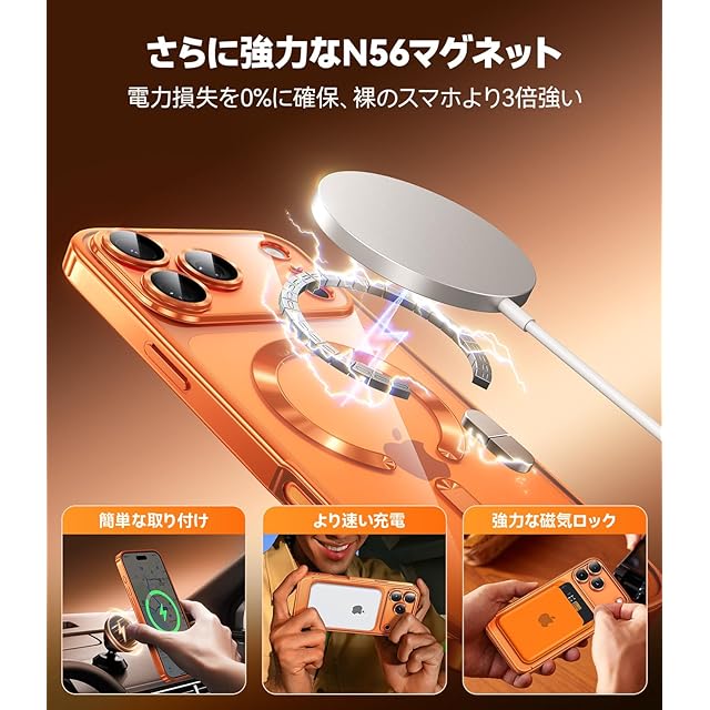 【超強力N56磁気配列・ロスゼロ高速充電】本iphone 17 Pro Max ケース magsafeは、内蔵48個のN56トップクラス磁石により、裸のスマホより磁力が3倍向上。吸着安定性が高く、車載ホルダーやモバイルバッテリーなど各種アクセサリーとの互換性を実現。高速ワイヤレス充電をサポートし、エネルギーロスゼロでより速く効率的な充電を可能に。磁気リングは精密研磨加工により手やデバイスを傷つけず、MagSafeエコシステムへの最適化に注力。