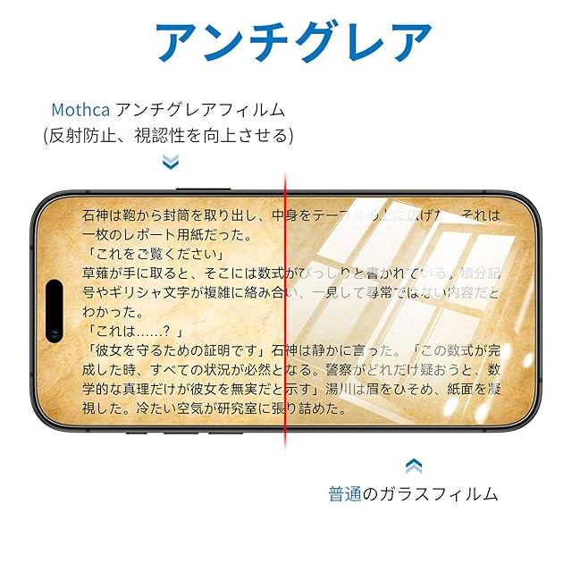 【アンチグレア・反射防止】対応機種:iPhone Air用アンチグレア ガラスフィルム。ガラス表面の反射防止加工が、光の映り込みや眩しさを大幅に低減します。視認性を向上させて画面を見えやすくすることで、長時間のスマホ操作や動画視聴でも目に優しく、疲れにくいです。