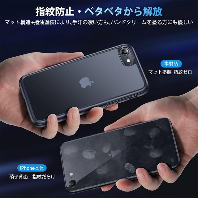 【滑り止め&指紋防止・すごく持ちやすさ】艶消しでマットな質感で手に持った時は背面が滑ることもなくフィットして、サラサラとした触り心地が最高のケース!また、側面の滑り止め設計により、滑りにくさが5倍向上し、持ち心地が従来品より63%改善。手にしっかり馴染み、滑り落ちる心配もない。特許取得済みの撥油塗装で、5年後でもさっぱりした質感を維持し、指紋の付着問題を完全に解消!マットな質感、触り心地、見た目、どれを取っても優勝!