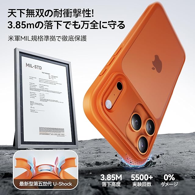 【米軍MIL認証済み・もしもの時も安心】米軍MIL規格「MIL-STD-810G」をクリアした強靭なiPhone 17 Pro 用ケース。四隅のU-Shock5.0と三層の耐衝撃構造により、3.85mの高さから5500回、36方向でアスファルトや砂利に落下させてもスマホ本体は無傷!日常使いから旅行まで、どんなシーンでも安心して使える。米軍MIL認証番号:GZMR220702237705