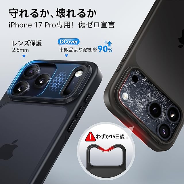 【特許取得のカメラ保護設計・細部まで豊かに】iPhone 17シリーズからカメラデザインは大きく進化し、レンズサイズも過去最大級へ。レンズ面積が拡大した分、傷や割れのリスクは大幅に増えていく。レンズが露出した市販ケースでは、ちょっとした衝撃が思わぬ高額修理に直結。そのため、CASEKOOから特許取得済みの半開口カメラ保護設計「DCover」が登場!ハニカム衝撃分散構造により、レンズ全体を縁からしっかり守り、衝撃吸収力は市販品比で90%アップします!iPhone 17時代のカメラ保護の新基準、それがCASEKOOの「DCover」!対応機種:アイフォン17pro ケース