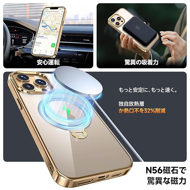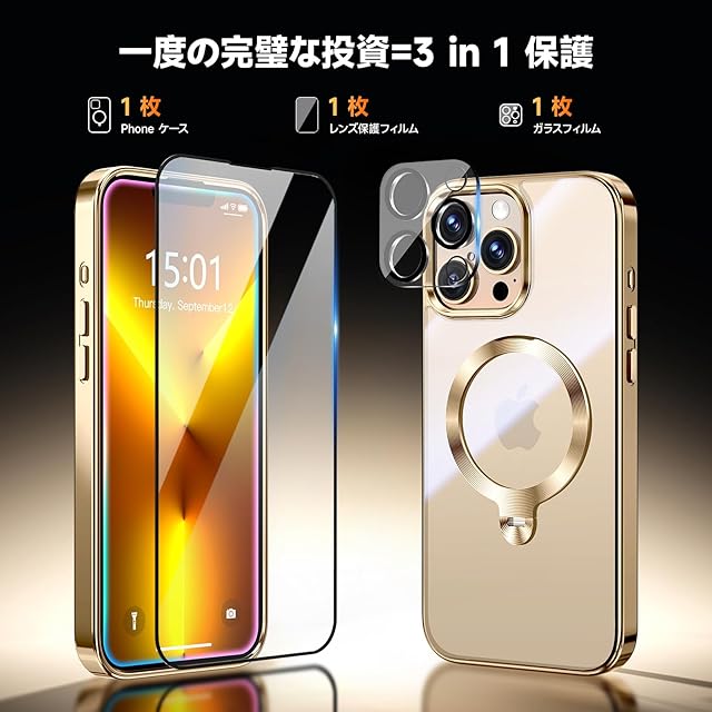 商品名:【三重保護セット!輝くメタリック光沢】OYR iPhone 13 Pro 用 クリア ケース Magsafe 対応[360°回転CD スタンド・10 万回開閉テスト][メッキバンパー・iPhone専属色][カメラ保護とガラスフィルム付き]ストラップホール付き マグセーフ アイホン13プロケース マホケース13 Pro 人気 米軍MIL規格取得・耐衝撃(6.1インチ・ゴールド)