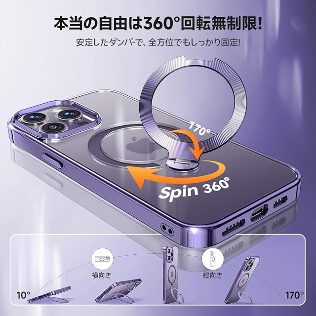 【360°回転!|耐久性・安定性・高級感全て揃えた】 市販品にありがちな「変形」、「緩み」、「安定性がない」などの悩みを、新しい製品にフィードバックして全ての問題を解消した!このiphone 14 promax ケース独自の技術を搭載し、10 万回以上の耐久テストをクリア。材質・形状・加工技術に徹底的にこだわり、市販品に比べて約10倍の圧倒的な耐久性と強度を実現したことにより、リングの部分緩みや破損も一気に解消!このiphone 14 promaxケースは縦 45° 直立から横 180° まで角度自在に調節できる。市販のスタンドが横置きを調整できず欠点を完全に解消しました!動画再生やビデオ通話などで、自分好みの角度に簡単に設定できます。カフェで集中作業する際、60° 傾けて iPhone を立てると、レポート作成中でもスマホでメール確認が両立。