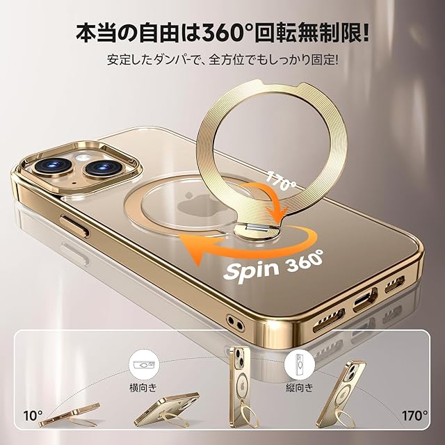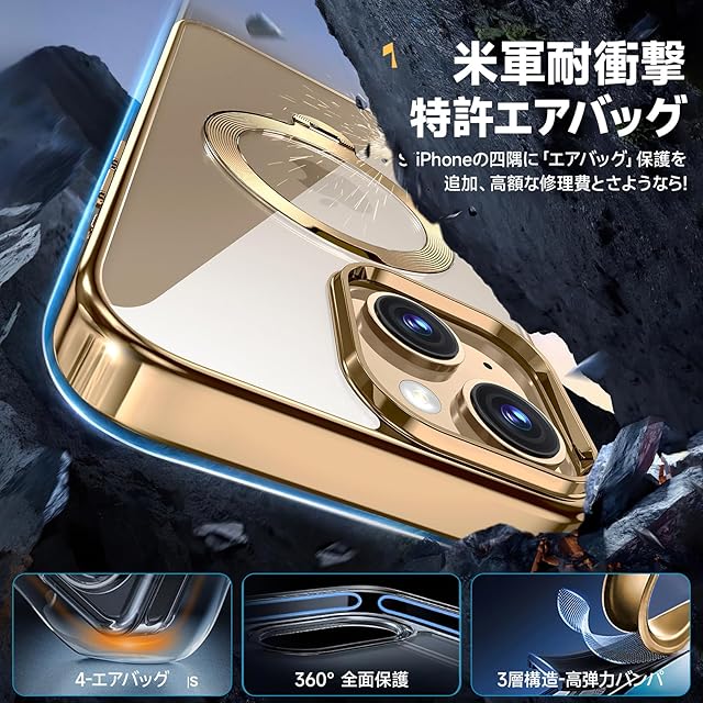 商品名:【三重保護セット!上品なメタリック光沢】OYR iPhone 15 用 クリア ケース Magsafe 対応[360°回転CD スタンド・10 万回開閉テスト][メッキバンパー・iPhone専属色][カメラ保護とガラスフィルム付き]ストラップホール付き マグセーフ アイホン15ケース マホケース15 人気 米軍MIL規格取得・耐衝撃(6.1インチ・ゴールド)