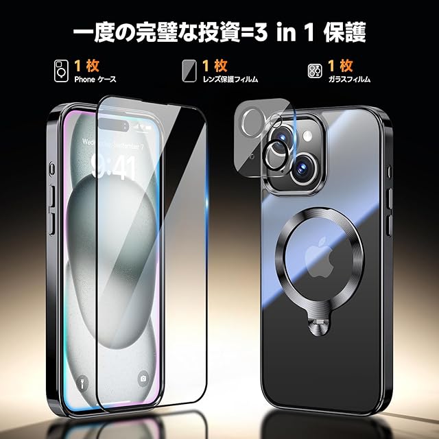 【一度の完璧な投資・三重保護セット!】 繰り返し選んで、何度も注文する面倒さに別れを告げます。最小限のコストで、万全のプロテクトを実現しましょう!ガラスフィルムは1200℃焼き戻し二次強化技術で作られた極細黒縁は端をしっかりと守り、2m落下実測で、どんな角度から落ちてもフチ割れの心配はご無用。スマホをバッグに放り込み、電車に揺られ、時に落とす——そんな日常のあらゆるシーンで、iPhone15 用のレンズフィルムを守るのは、宇宙航空素材と米軍MIL規格。このスマホ15 ケースの端末コーナーに1.2~1.5mm 段差設計を施して画面とカメラを保護し、3.8m 高さから 100 回落下しても亀裂を生じにくい。エッジの設計と一体化されたエアバッグ設計が、意図しない落下に対して360°の包括的な保護を提供し、バンパーのような役割を果たす。すべてのディテールが精密に仕上げられており、あらゆる衝撃から最強の保護を提供する。
