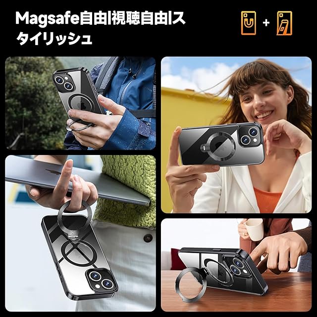 【三重保護セット!永久黄変防止】OYR iPhone 15用クリア ケース Magsafe 対応[360°回転CD スタンド・10 万回開閉テスト][メッキバンパー・iPhone専属色][カメラ保護とガラスフィルム付き]ストラップホール付き マグセーフ アイホン15ケース マホケース15 人気 米軍MIL規格取得・耐衝撃(6.1インチ・ブラック)