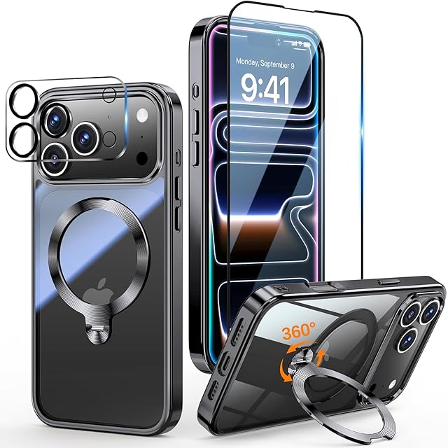【三重保護セット!上品なメタリック光沢】OYR iPhone 17 Pro Max用クリア ケース Magsafe 対応[360°回転CD スタンド・10 万回開閉テスト][メッキバンパー・iPhone専属色][カメラ保護とガラスフィルム付き]ストラップホール付き マグセーフ アイホン17プロマックスケース マホケース17 Pro Max 人気 米軍MIL規格取得・耐衝撃(6.9インチ・ブラック)