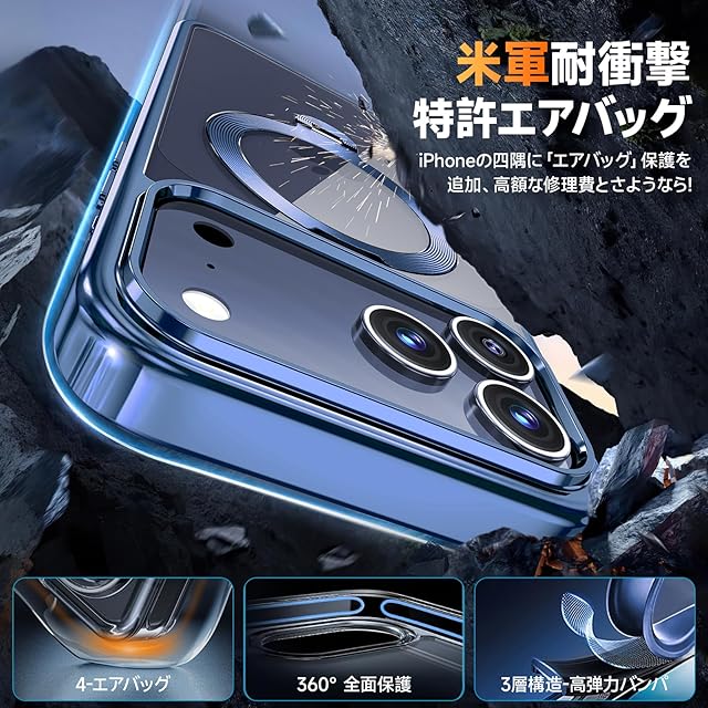 商品名:【三重保護セット!上品なメタリック光沢】OYR iPhone 17 Pro Max用クリア ケース Magsafe 対応[360°回転CD スタンド・10 万回開閉テスト][メッキバンパー・iPhone専属色][カメラ保護とガラスフィルム付き]ストラップホール付き マグセーフ アイホン17プロマックスケース マホケース17 Pro Max 人気 米軍MIL規格取得・耐衝撃(6.9インチ・ブルー)