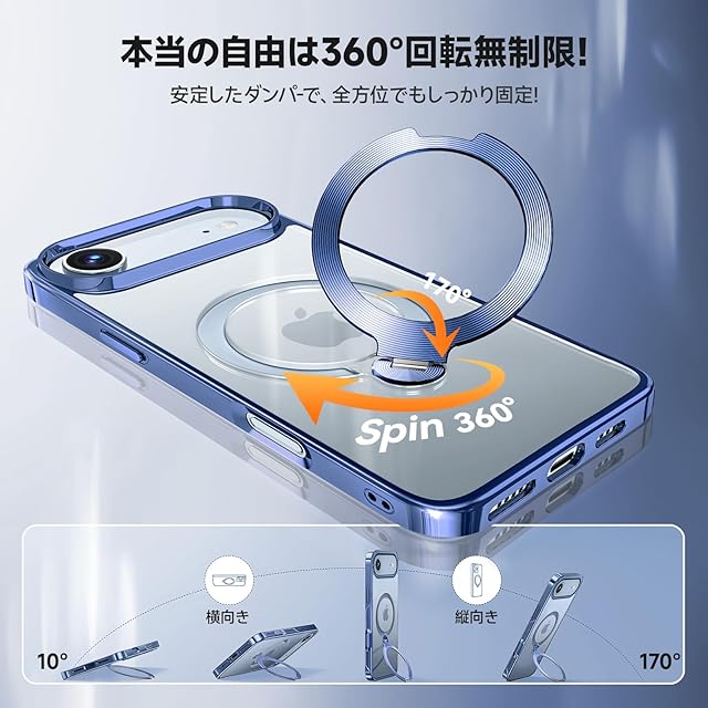 【360°回転!|耐久性・安定性・高級感全て揃えた】 市販品にありがちな「変形」、「緩み」、「安定性がない」などの悩みを、新しい製品にフィードバックして全ての問題を解消した!このiphone Air ケース独自の技術を搭載し、10 万回以上の耐久テストをクリア。材質・形状・加工技術に徹底的にこだわり、市販品に比べて約10倍の圧倒的な耐久性と強度を実現したことにより、リングの部分緩みや破損も一気に解消!このiphone Airケースは縦 45° 直立から横 180° まで角度自在に調節できる。市販のスタンドが横置きを調整できず欠点を完全に解消しました!動画再生やビデオ通話などで、自分好みの角度に簡単に設定できます。カフェで集中作業する際、60° 傾けて iPhone を立てると、レポート作成中でもスマホでメール確認が両立。