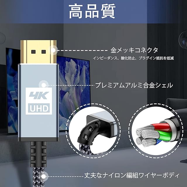 <b>高画質・高音質の安定伝送</b><br> ►スリムな端子なのに高遮蔽性 <br>►コネクタはミニマリズムで、抜き差し心地と配線を両立。<br> ►ノイズ防ぐブリキ防護層・防護線材を内蔵しており<br>►安定した高画質をお楽しんでください。<br> <br>4K/Ultra HD対応のPremium HDMI Cable規格<br> ■4K/60Hz<br> ■HDR<br> ■フルHD・ 3D映像<br> ■HEC(HDMIイーサネットチャンネル)<br> ■ARC(オーディオリターンチャンネル)<br> ■BT.2020、Deep color対応<br> ■18Gbps高速伝送対応 <br><br>映像転送</b><br> 4K 3840×2160 30Hz 60Hz <br>2K 2560×1600 165Hz 144Hz <br>2K 2560×1440 165Hz <br>144Hz 1080p 1920×1080 167Hz