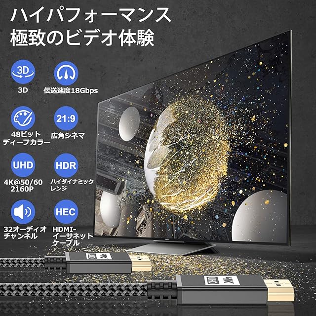 【高画素 高音質】:Premium HDMI製品、4K/60Hz・HDR・HEC(イーサネット通信)・フルHD・3D映像・ARC(双方向音声)・CEC(基本リンク機能)・高速伝送18Gbpsなどに対応しています。一本で高画質映像と音声を忠実に伝送します。明快さとリアリズムをお楽します。