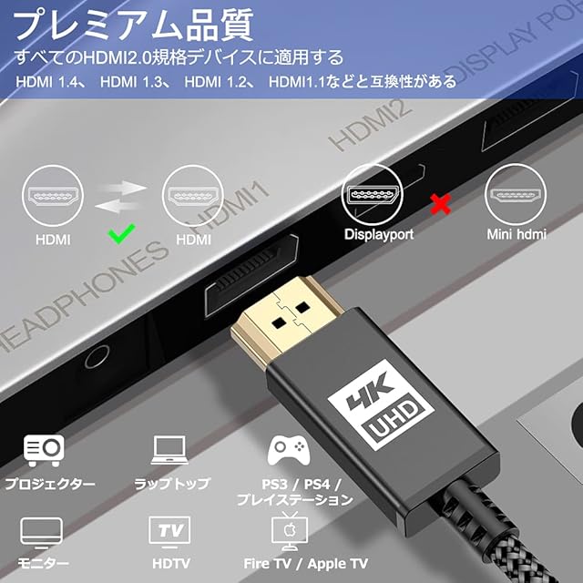【対応機種】:最新規格HDMI 2.0 ケーブルはApple TV 4K, ブルーレイプレーヤー,Roku Ultra, PS4, PS4 Pro/PS3, Wii U, ノートPCなどに適用できます。