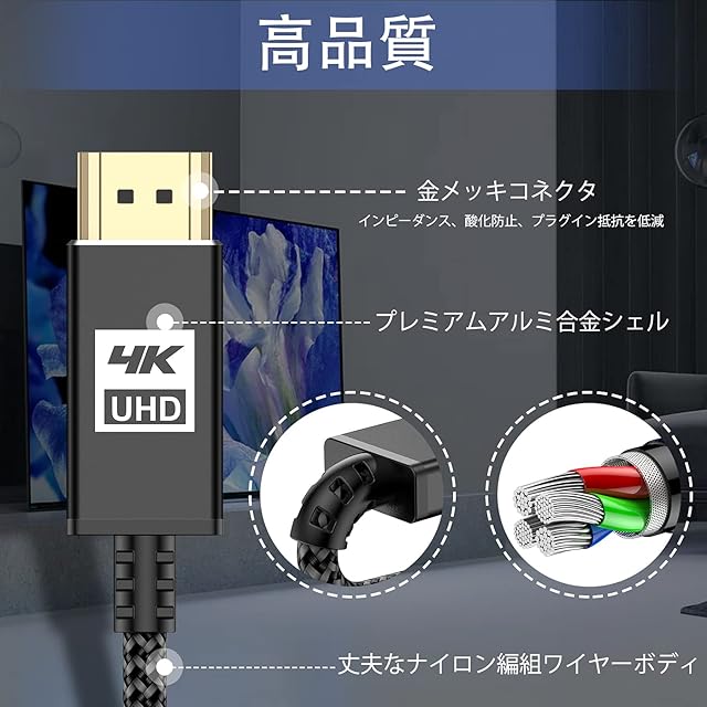 <b>高画質・高音質の安定伝送</b><br> ►スリムな端子なのに高遮蔽性 <br>►コネクタはミニマリズムで、抜き差し心地と配線を両立。<br> ►ノイズ防ぐブリキ防護層・防護線材を内蔵しており<br>►安定した高画質をお楽しんでください。<br> <br>4K/Ultra HD対応のPremium HDMI Cable規格<br> ■4K/60Hz<br> ■HDR<br> ■フルHD・ 3D映像<br> ■HEC(HDMIイーサネットチャンネル)<br> ■ARC(オーディオリターンチャンネル)<br> ■BT.2020、Deep color対応<br> ■18Gbps高速伝送対応 <br><br>映像転送</b><br> 4K 3840×2160 30Hz 60Hz <br>2K 2560×1600 165Hz 144Hz <br>2K 2560×1440 165Hz <br>144Hz 1080p 1920×1080 167Hz