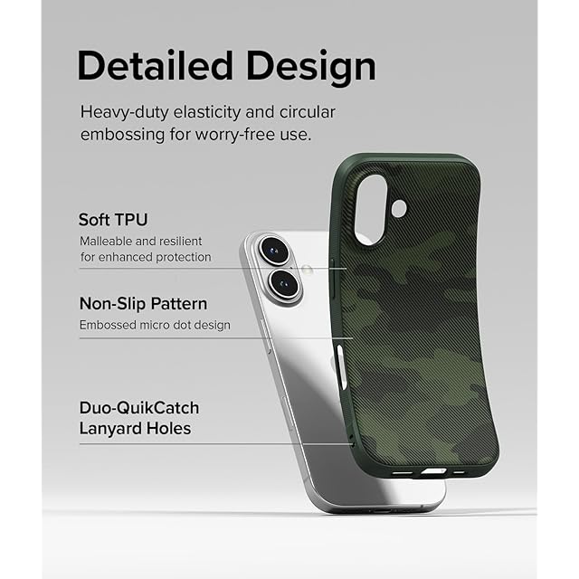 耐久性と保護性に優れたRingke Onyxケースで、iPhone 16をスタイリングできます。<br> 他の堅牢な保護ケースとは異なり、Ringke Onyxはスリムで軽量で、デバイスの重量と体積を軽減します。<br><br> 印象的なデザインは、高品質で柔軟性のあるTPU素材により、強力な防御を実現します。 <br> 正確にカットされた熱可塑性ポリウレタンは、丈夫で弾力性のある保護層を使用して、スマートフォンのスリムで合理的な外観を強化し、デバイスのすべての端と曲線に沿って密接に輪郭を形成します。 また、電話機を快適かつ完全に使用するために必要なすべての機能ポートとボタンにもすぐにアクセスできます。<br><br> TPU素材は、日常使用時の傷や擦り傷からの保護を最適化する柔軟なフィットでデバイスを簡単に固定できるように特化されています。<br> ケースの側面に沿って目立つ円形エンボスが走り、携帯電話のグリップ力を高め、偶発的な落下を防ぎます。<br> ケースの背面は指紋に強いマットな質感で、肌に柔らかさを感じ、快適で長時間のデバイス使用が可能です。<br><br> また、前面リップがスリムに隆起しているため、前面を下にして置くと画面が平らな面に触れないように保護され、背面カメラはベゼルを隆起させて傷を防ぎます。<br><br> Duo-QuikCatchのランヤードホールは、あらゆる状況に対応して携帯性に優れたデバイスです! 指、手首、ネックストラップなどの付属品を装着することで、簡単かつ便利に携帯できます。 クロスボディーストラップでも、アップグレードされたQuikCatchランヤードホールで携帯電話を固定することができます。 **トラップは含まれません**