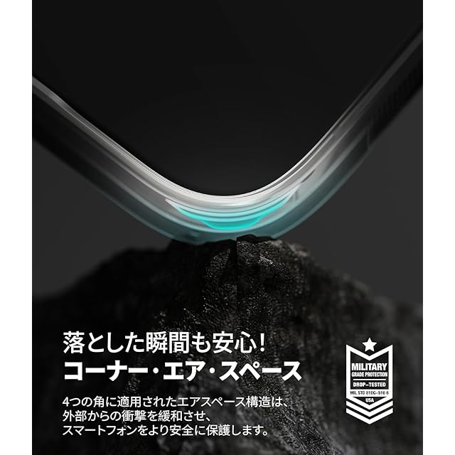 【エアスペース設計】衝撃を吸収する角部分のエアスペース設計とクショニングを考慮した高弾性素材技術でスマートフォンを強力に保護します。