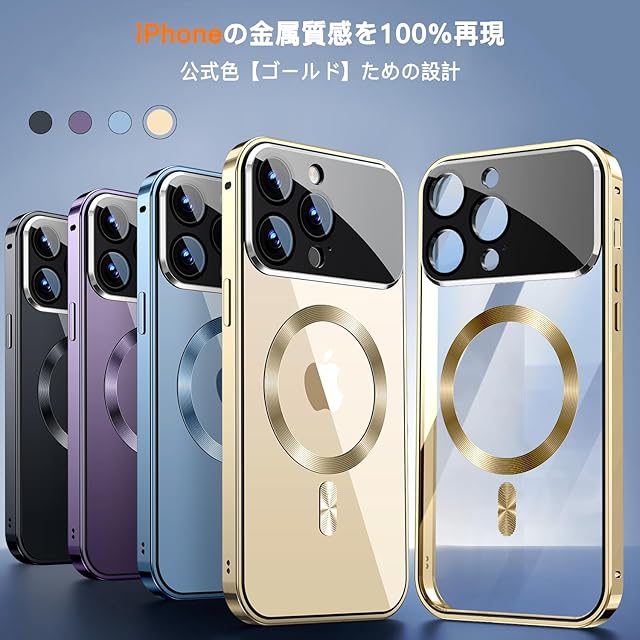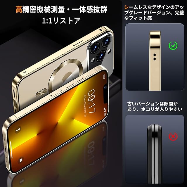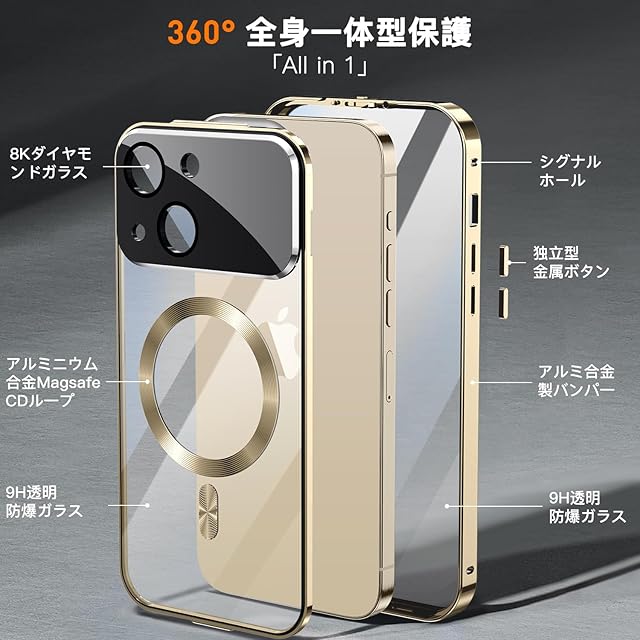 商品名:Rosycover【新次元の一体型レンズ・メカニカルロック】iPhone 13 Mini 用の ケース Mag-safe対応[360°全面保護・両面強化ガラス][本体の色・CD Mag-safeリング]マグセーフ ワイヤレス充電対応 ストラップホール付き アルミ合金バンパース アイホン13ミニ 金属 ケースマホケース13 Mini クリア 人気 5.4インチ(ゴールド)
