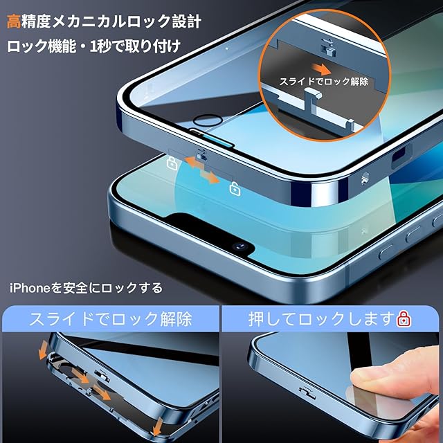 【高精度メカニカルロック和360 ° 全面保護】このiPhone 13 Pro Maxケースの上部には高精度のメカニカルロックが搭載されており、1回のスライドで1秒でロック/ロック解除が可能です。スマホケースを両側でしっかりとロックします。落としてもスマホがケースから落ちない、iPhoneを安全にロックする。さらに、複数の素材のアップグレードにより、ロックの耐久性と精度が大幅に向上しました。このいPhone 13 Pro Maxケースの両面は硬度9hの強化ガラス製です、側面には高品質の航空アルミ合金製を採用した高級感のある作り。前面、背面、側面、レンズをカバーできます。スクリーンプロテクターとレンズプロテクターを個別に購入するコストを節約し、ワンストップソリューションを提供します。