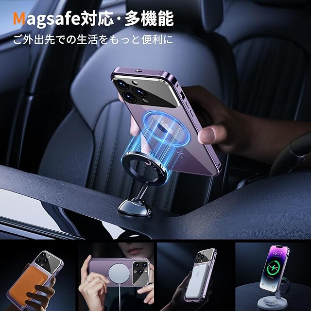 【CDパターン磁石リング・Mag-safe充電体験進化】 CD レコードの質感からインスピレーションを得たこのデザインはアルミニウム合金製で、そして独特の金属光沢感があります。iPhoneを個性的に飾り、お洒落なスマホライフを楽しんでください!このアイフォン14プロケースは「N52H永久磁石技術」を使用して磁力を強化すると同時に、低温で安全かつ安定的に内蔵バッテリーへの電力をエスコートします、それにより効果的に発熱を防ぎ、バッテリーの使用寿命を延ばします。このアイフォン14プロケースはMag-safeアクセサリーやQIワイヤレス充電器と完璧に連携し、18Nの強力な磁力でしっかり固定され、車載ホルダーに取り付けると、激しい山道を走行しても決して落ちない。