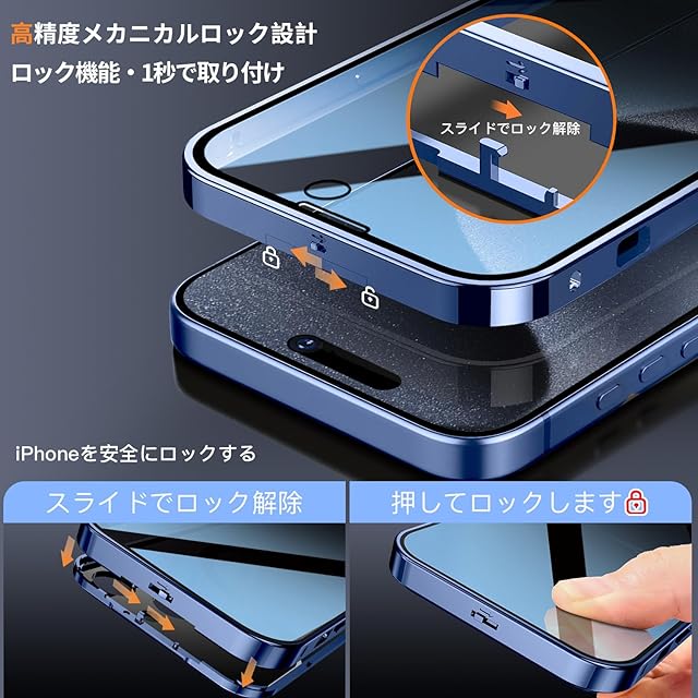 【高精度メカニカルロック和360 ° 全面保護】このiPhone 15 Pro Maxケースの上部には高精度のメカニカルロックが搭載されており、1回のスライドで1秒でロック/ロック解除が可能です。スマホケースを両側でしっかりとロックします。落としてもスマホがケースから落ちない、iPhoneを安全にロックする。さらに、複数の素材のアップグレードにより、ロックの耐久性と精度が大幅に向上しました。このいPhone 15 Pro Maxケースの両面は硬度9hの強化ガラス製です、側面には高品質の航空アルミ合金製を採用した高級感のある作り。前面、背面、側面、レンズをカバーできます。スクリーンプロテクターとレンズプロテクターを個別に購入するコストを節約し、ワンストップソリューションを提供します。