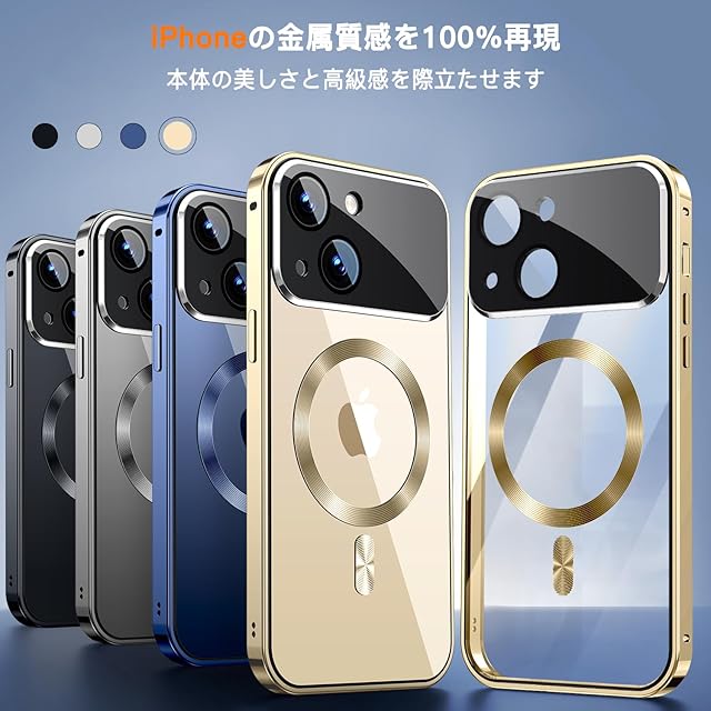 Rosycover【新次元の一体型レンズ・メカニカルロック】iPhone 15 用の ケース Magsafe対応 [360°全面保護・両面強化ガラス][本体の色・CD Magsafeリング]マグセーフ ワイヤレス充電対応 ストラップホール付き アルミ合金バンパース アイホン15 金属 ケースマホケース15 クリア 人気 6.1インチ(ゴールド)