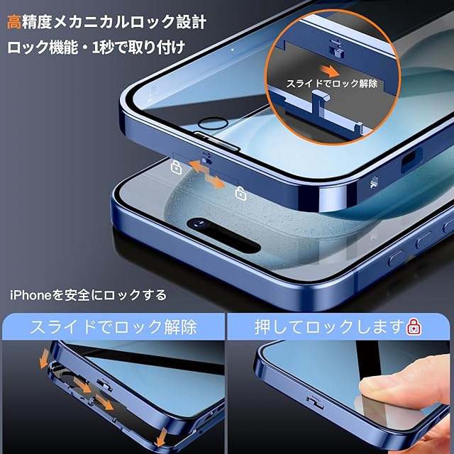 【高精度メカニカルロック和360°全面保護】このiPhone 15 ケースの上部には高精度のメカニカルロックが搭載されており、1回のスライドで1秒でロック/ロック解除が可能です。スマホケースを両側でしっかりとロックします。落としてもスマホがケースから落ちない、iPhoneを安全にロックする。さらに、複数の素材のアップグレードにより、ロックの耐久性と精度が大幅に向上しました。このいPhone15ケースの両面は硬度9hの強化ガラス製です、側面には高品質の航空アルミ合金製を採用した高級感のある作り。前面、背面、側面、レンズをカバーできます。スクリーンテクターとレンズテクターを個別に購入するコストを節約し、ワンストップソリューションを提供します。