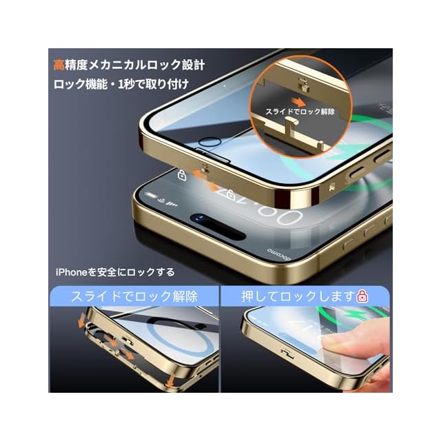 【高精度メカニカルロック和360°全面保護】このiPhone 16 plus ケースの上部には高精度のメカニカルロックが搭載されており、1回のスライドで1秒でロック/ロック解除が可能です。スマホケースを両側でしっかりとロックします。落としてもスマホがケースから落ちない、iPhoneを安全にロックする。さらに、複数の素材のアップグレードにより、ロックの耐久性と精度が大幅に向上しました。このいPhone16 plusケースの両面は硬度9hの強化ガラス製です、側面には高品質の航空アルミ合金製を採用した高級感のある作り。前面、背面、側面、レンズをカバーできます。スクリーンテクターとレンズテクターを個別に購入するコストを節約し、ワンストップソリューションを提供します。