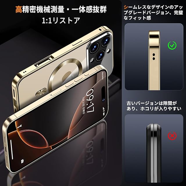 商品名:Rosycover【新次元の一体型レンズ・メカニカルロック】iPhone 16 Pro Max 用の ケース Magsafe対応[360°全面保護・両面強化ガラス][本体の色・CD Magsafeリング]マグセーフ ワイヤレス充電対応 ストラップホール付き アルミ合金バンパース アイホン16プロマックス 金属 ケースマホケース16 Pro Max クリア 人気 6.9インチ(ゴールド)