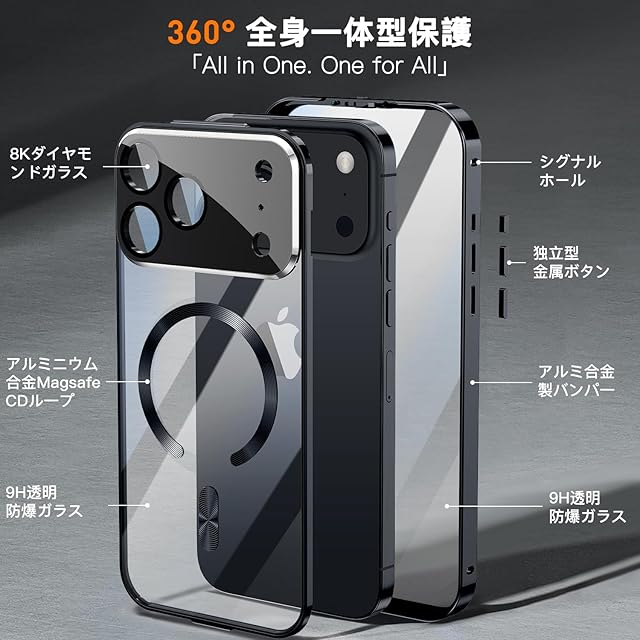 【高精度メカニカルロック和360 ° 全面保護】このiPhone 17 Proケースの上部には高精度のメカニカルロックが搭載されており、1回のスライドで1秒でロック/ロック解除が可能です。スマホケースを両側でしっかりとロックします。落としてもスマホがケースから落ちない、iPhoneを安全にロックする。さらに、複数の素材のアップグレードにより、ロックの耐久性と精度が大幅に向上しました。このいPhone 17 Proケースの両面は硬度9hの強化ガラス製です、側面には高品質の航空アルミ合金製を採用した高級感のある作り。前面、背面、側面、レンズをカバーできます。スクリーンプロテクターとレンズプロテクターを個別に購入するコストを節約し、ワンストップソリューションを提供します。