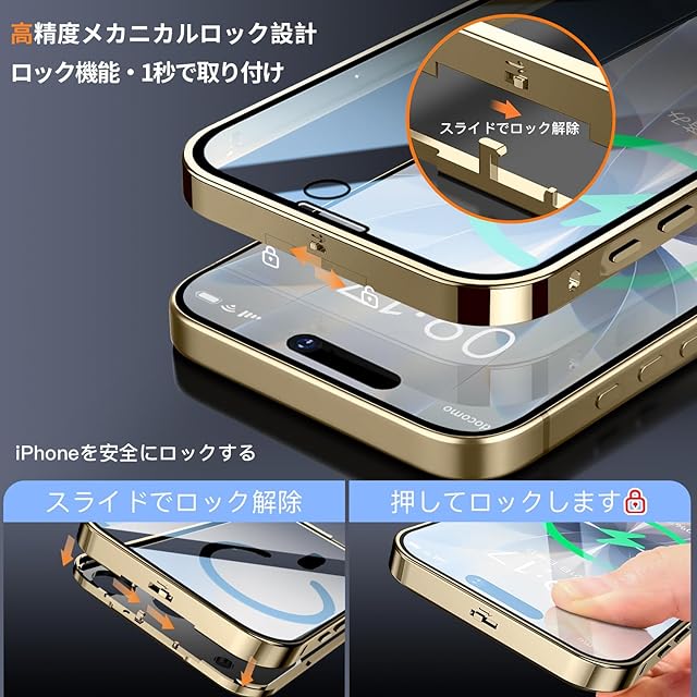 【高精度メカニカルロック和360°全面保護】このiPhone 17 ケースの上部には高精度のメカニカルロックが搭載されており、1回のスライドで1秒でロック/ロック解除が可能です。スマホケースを両側でしっかりとロックします。落としてもスマホがケースから落ちない、iPhoneを安全にロックする。さらに、複数の素材のアップグレードにより、ロックの耐久性と精度が大幅に向上しました。このいPhone17ケースの両面は硬度9hの強化ガラス製です、側面には高品質の航空アルミ合金製を採用した高級感のある作り。前面、背面、側面、レンズをカバーできます。スクリーンテクターとレンズテクターを個別に購入するコストを節約し、ワンストップソリューションを提供します。