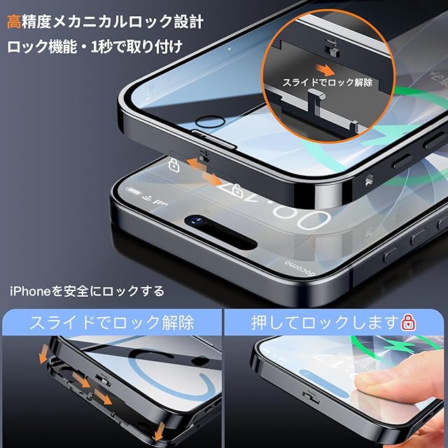 【高精度メカニカルロック和360°全面保護】このiPhone 17 ケースの上部には高精度のメカニカルロックが搭載されており、1回のスライドで1秒でロック/ロック解除が可能です。スマホケースを両側でしっかりとロックします。落としてもスマホがケースから落ちない、iPhoneを安全にロックする。さらに、複数の素材のアップグレードにより、ロックの耐久性と精度が大幅に向上しました。このいPhone17ケースの両面は硬度9hの強化ガラス製です、側面には高品質の航空アルミ合金製を採用した高級感のある作り。前面、背面、側面、レンズをカバーできます。スクリーンテクターとレンズテクターを個別に購入するコストを節約し、ワンストップソリューションを提供します。