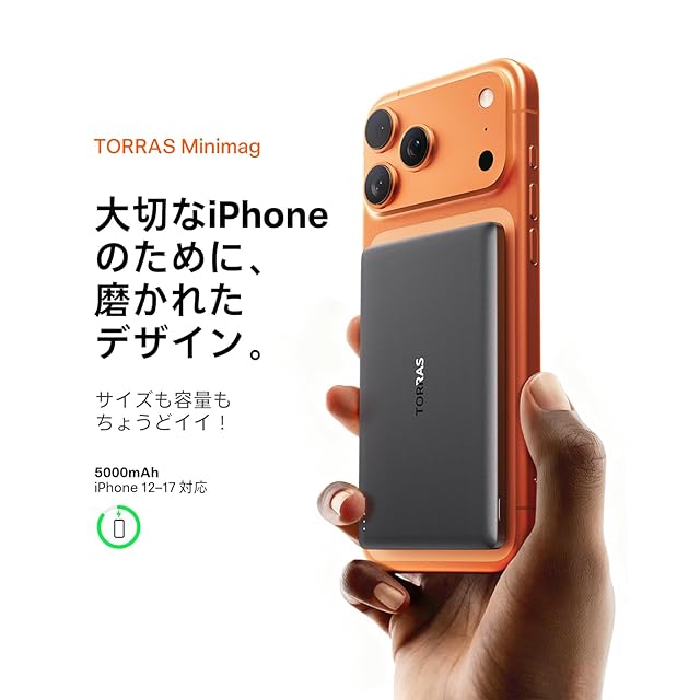 iPhoneの最高の相棒:iPhone 17シリーズのために特別に作られたという「TORRAS MiniMag」。iPhoneらしいつるんっとしたなデザイン、Airの薄さでも“できるだけ”邪魔しない極薄なデザインです。さらに、5000mAh大容量でiPhone 17 Airを最大117%追加で充電できるので、長時間バッテリーが持続します。