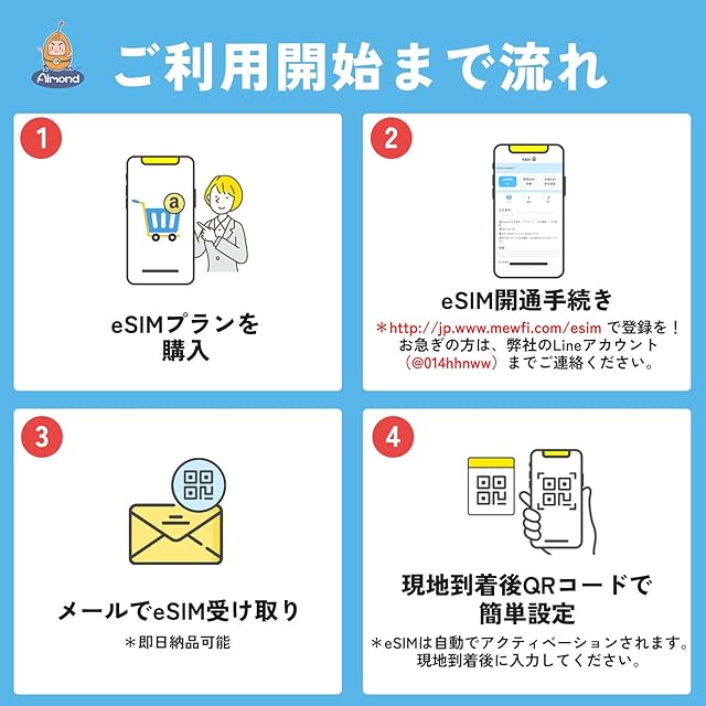 【ご一読】eSIMカード(QRコード)をご注文された後、通常は注文日を含む1日以内に、http://jp.www.mewfi.com/esimにて注文番号とメールアドレスを入力することで、eSIMのQRコードと設定方法がメールで送られます。もし急ぎでQRコードが必要な場合は、お支払い完了後にカスタマーサポート(LINE ID: @014hhnww)へご連絡いただくと、通常は当日中にQRコードを発行することが可能です。