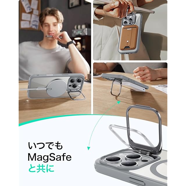 【調節可能な隠れスタンド】折りたたんだときにカメラのフレームに隠れるように配置され、MagSafeリングを100%妨げず、いつでもどこでも自由に調整でき、安定した角度で動画を視聴できます。対応機種:iphone16pro ケース