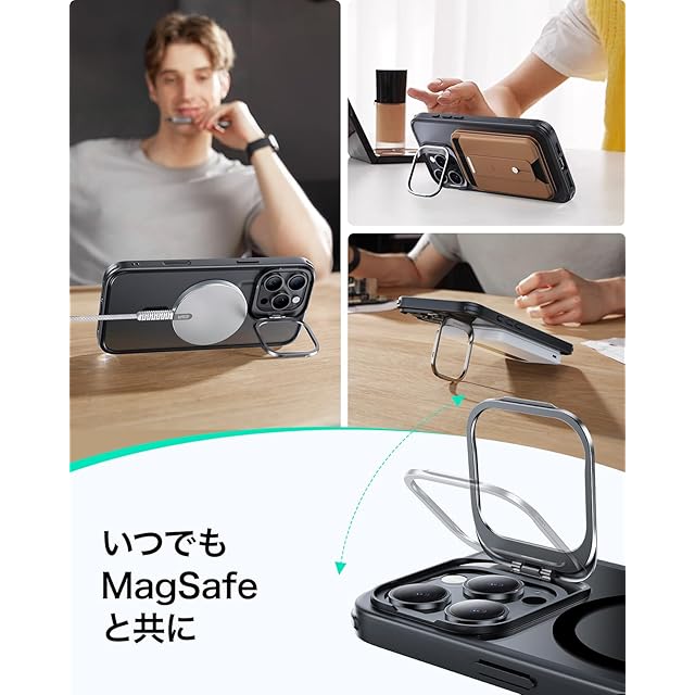 【調節可能な隠れスタンド】折りたたんだときにカメラのフレームに隠れるように配置され、いPhone 16 Pro Max ケースのMagSafeリングを100%妨げず、いつでもどこでも自由に調整でき、安定した角度で動画を視聴できます