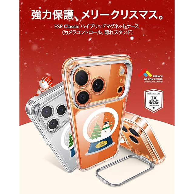 商品名:【デザイン受賞シリーズ!】ESR iPhone 17 Pro ケース MagSafe対応 3倍米軍MIL規格 カメラコントロールカバー 隠れスタンド 調整可能 ワイヤレス充電 エアガードコーナー 耐衝撃 傷防止 軽量 マグネットスマホケース 高耐久性 Qi2.2対応 最大25W高速充電 いphone17pro ケース iphone17Pro用Classicシリーズ クリスマスの水晶玉