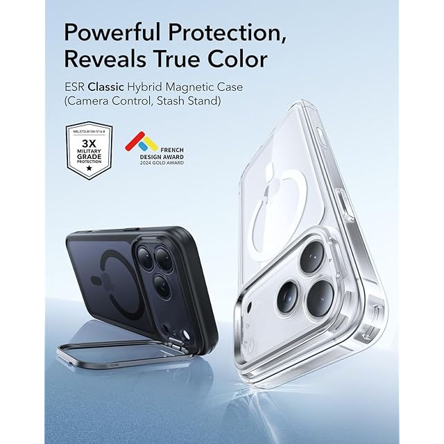 【デザイン受賞シリーズ!】ESR iPhone 17 Pro ケース MagSafe対応 3倍米軍MIL規格 カメラコントロールカバー 隠れスタンド 調整可能 2層構造カメラ保護 ワイヤレス充電 エアガードコーナー 耐衝撃 傷防止 軽量 マグネットスマホケース 高耐久性 Qi2.2対応 最大25W高速充電 いphone17pro ケース iphone17Pro用Classicシリーズ ブラック