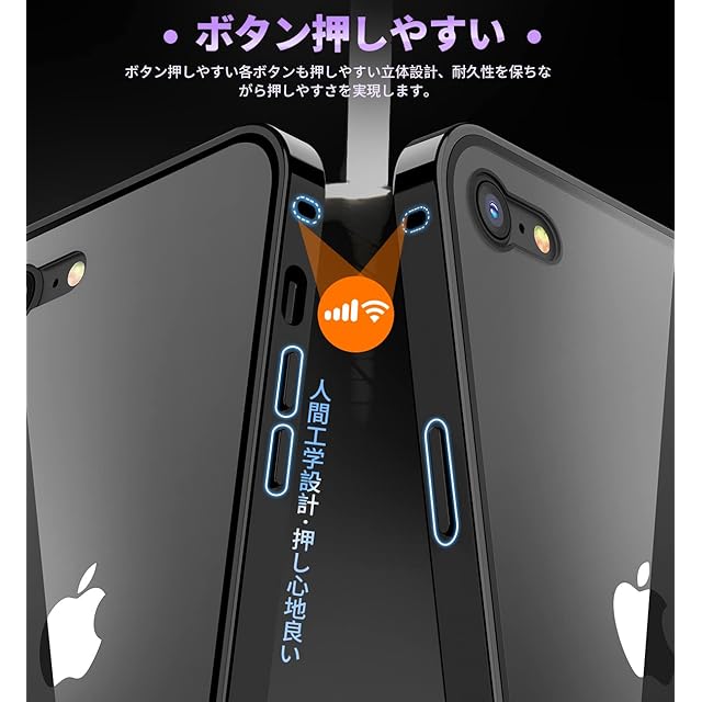 【メタルフレーム・背面クリア・信号干渉なし】このスマホケース iphone SE3/SE2/8/7は、高品質の航空アルミニウム合金製フレームを使用しており、おしゃれで高級感が溢れています。酸化の表面処理により保護カバーは擦れに強い、傷つきにくい。このiPhone SE3 iPhone SE2/8/7全面保護ケースの背面として高透過率に経ったガラス素材を用い、本体の色をより良く楽しめる、より一層高級感を引き出せます。本体の美しさをエンジョイする際に、ご好みの写真・ステッカーなども入れ、カスタマイズが可能です。このiPhone SE3 ケース iPhone SE2/8/7 ケースは信号強度が影響を受けないように設計されています。ケースはマグネットを使用しない、電波を遮らないように受信専用の穴を設けてあるため、信号は良好で、WiFiは遮られていません。