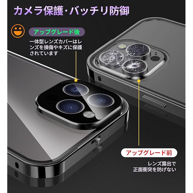 【両面9H強化ガラス・高感度タッチ】このiPhone12 Pro ケースは、9H硬度ガラス素材を採用されて、鍵やカッターなどの鋭利なもので切りつけてもキズが付きにくく、耐衝撃性と耐傷性に優れています。両面9H強化ガラス + ロック機能付きメタルフレームの組み合わせにより、落下保護が向上し、iPhone12 Proを全方位からしっかりと守れます。前カバーの画面、3Dタッチ機能により、応答性能が優れています。特殊コーティング技術でスムースな指すべりで操作性アップでゲームをしても楽しめます。★注意:画面保護フィルムを貼ってる必要はありません、操作反応が低下します。