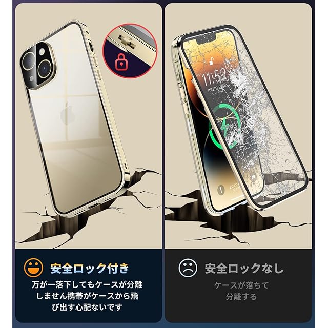 【両面9H強化ガラス・高感度タッチ】このiPhone13 ケースは、9H硬度ガラス素材を採用されて、鍵やカッターなどの鋭利なもので切りつけてもキズが付きにくく、耐衝撃性と耐傷性に優れています。両面9H強化ガラス + ロック機能付きメタルフレームの組み合わせにより、落下保護が向上し、iPhone13を全方位からしっかりと守れます。前カバーの画面、3Dタッチ機能により、応答性能が優れています。特殊コーティング技術でスムースな指すべりで操作性アップでゲームをしても楽しめます。注意:画面保護フィルムを貼ってる必要はありません、操作反応が低下します。