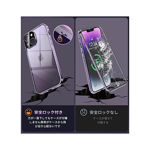 【両面9H強化ガラス・高感度タッチ】このiPhone14 Plus ケースは、9H硬度ガラス素材を採用されて、鍵やカッターなどの鋭利なもので切りつけてもキズが付きにくく、耐衝撃性と耐傷性に優れています。両面9H強化ガラス + ロック機能付きメタルフレームの組み合わせにより、落下保護が向上し、iPhone14 Plusを全方位からしっかりと守れます。前カバーの画面、3Dタッチ機能により、応答性能が優れています。特殊コーティング技術でスムースな指すべりで操作性アップでゲームをしても楽しめます。注意:画面保護フィルムを貼ってる必要はありません、操作反応が低下します。