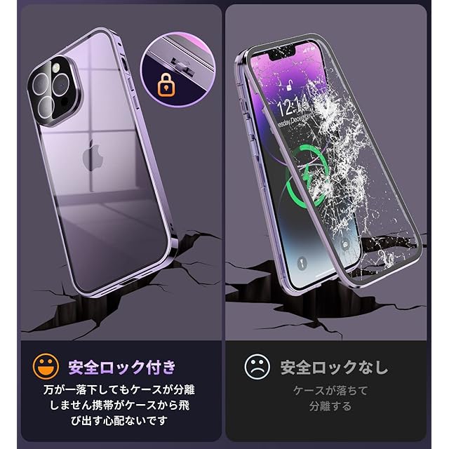 【両面9H強化ガラス・高感度タッチ】このiPhone14 Pro Max ケースは、9H硬度ガラス素材を採用されて、鍵やカッターなどの鋭利なもので切りつけてもキズが付きにくく、耐衝撃性と耐傷性に優れています。両面9H強化ガラス + ロック機能付きメタルフレームの組み合わせにより、落下保護が向上し、iPhone14 Pro Maxを全方位からしっかりと守れます。前カバーの画面、3Dタッチ機能により、応答性能が優れています。特殊コーティング技術でスムースな指すべりで操作性アップでゲームをしても楽しめます。注意:画面保護フィルムを貼ってる必要はありません、操作反応が低下します。