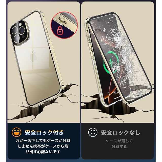 【両面9H強化ガラス・高感度タッチ】このiPhone16 Pro Max ケースは、9H硬度ガラス素材を採用されて、鍵やカッターなどの鋭利なもので切りつけてもキズが付きにくく、耐衝撃性と耐傷性に優れています。両面9H強化ガラス + ロック機能付きメタルフレームの組み合わせにより、落下保護が向上し、iPhone16 Pro Maxを全方位からしっかりと守れます。前カバーの画面、3Dタッチ機能により、応答性能が優れています。特殊コーティング技術でスムースな指すべりで操作性アップでゲームをしても楽しめます。注意:画面保護フィルムを貼ってる必要はありません、操作反応が低下します。
