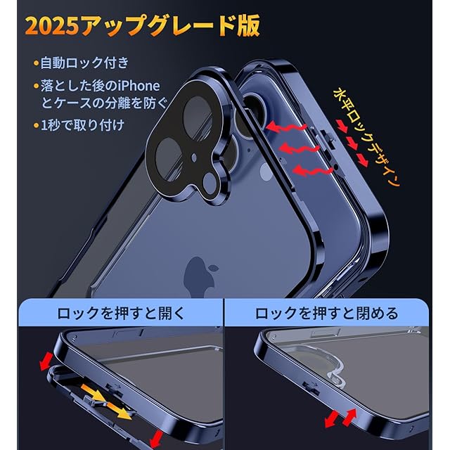 【ロック機能付き・1秒で取り付け・一体型レンズ保護付き】革新的な技術、このiPhone17 両面ケースは上部にスライドボタン式のロックがあり、前後のケースをしっかり固定します。上部のボタンを押すだけで、ロックの解除も簡単、取り付けで開く非常に便利です。こちらのあいふぉん17ケースであなたの大切なスマホを守ってあげてください!このiPhone17 ケースのバンパーとレンズ保護フィルムが一体型になっており、背面カメラ周りを覆い、カメラへの傷を防ぐ、カメラレンズ保護設計です。レンズの保護フィルムの必要はありません。