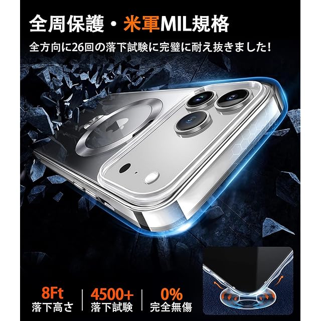 【細部までこだわる保護!米国MIL規格取得】カバーの縁はアイフォン17 Proの液晶画面より1.55mm高く、カメラレンズより1.2mm高い、併用の全面保護ガラスフィルムで平置きしても画面は接触しない、細部までの保護も配慮され、より一層な安心感を与えられる。米軍規格の「MIL-STD-810G」をクリアしたiPhone 17 Pro ケース。360°クッションとX-PRO3代目を搭載し、3D立体緩衝ベルトを構築し、衝撃を吸収して、iPhone 17 Proを完全に保護します。また、内蔵のX-shockエアバッグと360°のリングエアバッグで、衝撃エネルギーの99%を吸収。街での落下も、バッグからの転落も、全てのガード!